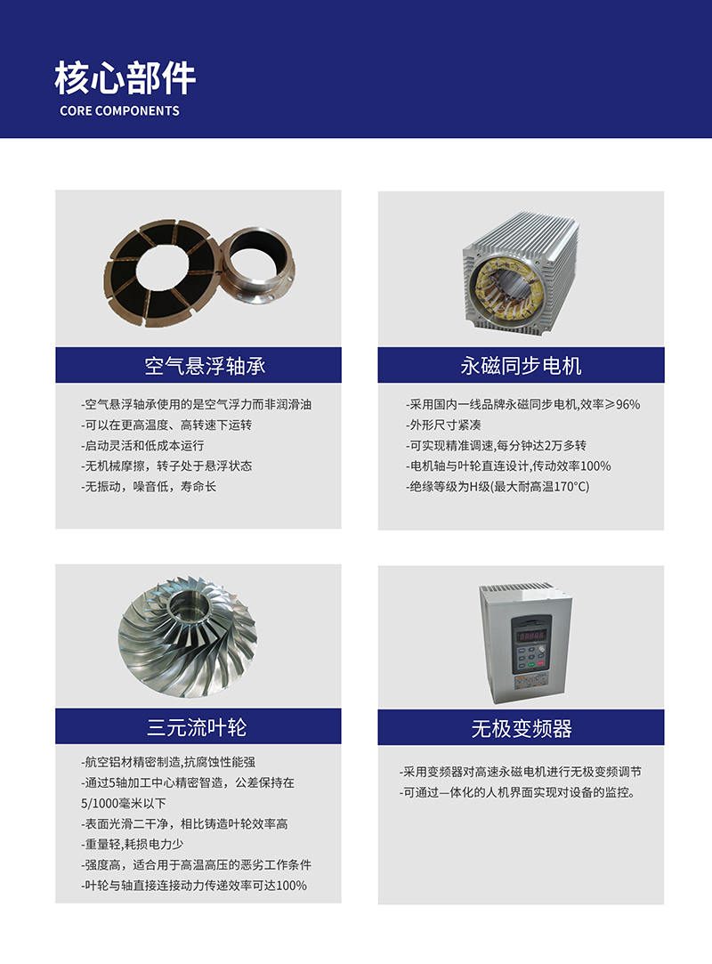 空氣懸浮鼓風機主要包括葉輪、空氣懸浮軸承、變頻器、高速永磁電機及其結(jié)構(gòu)控制系統(tǒng)。電機主軸與風機葉輪同軸,高速轉(zhuǎn)子系統(tǒng)由空氣懸浮軸承直接支撐。其主要核心技術(shù)是空氣懸浮軸承技術(shù)、高速永磁同步電動機及其控制技術(shù)。空氣懸架軸承以空氣為工作介質(zhì),以彈性平坦箔片為支撐面,以彈性波浪箔片為支撐構(gòu)件。