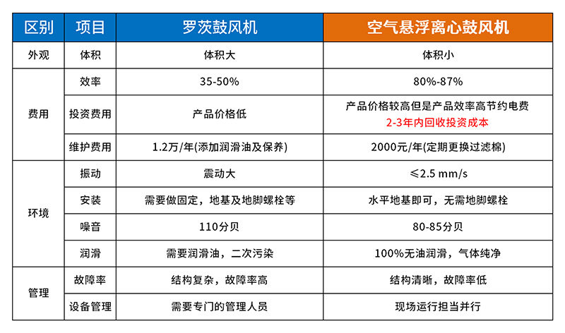 高效率:與羅茨鼓風機比較,懸浮鼓風機效率提高30%以上